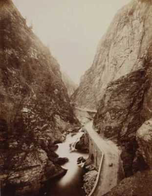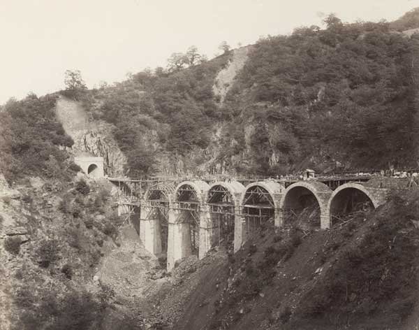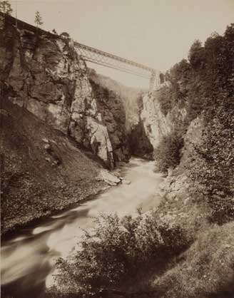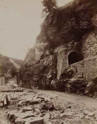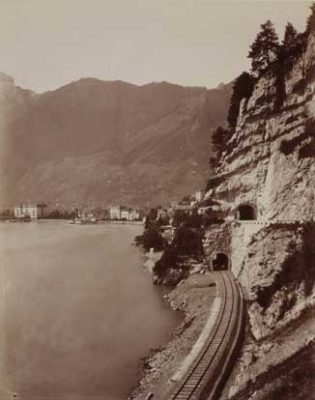 La jonction des deux tronçons du tunnel du Gothard, entre les cantons d’Uri et du Tessin, a lieu le 29 février 1880 et l'inauguration officielle le 1er juin 1882. La photographie ci-contre a été prise peu avant la grève des deux mille ouvriers italiens du secteur nord du chantier, qui s'est terminée avec les coups de feu d'un contingent uranais et a fait plusieurs morts. |Les problèmes sociaux qui sont le revers du développement économique apparaissent alors dans toute leur ampleur. Le reportage de Braun comprend des vues saisissantes de la conquête des Alpes par l’industrie. Comme le remarque Viollet-le-Duc, les chemins de fer permettent alors aux voyageurs de découvrir plus de monuments en une semaine qu’auparavant en un mois. L’édition de cartes postales de paysages suisses accompagne ainsi le déploiement du tourisme.